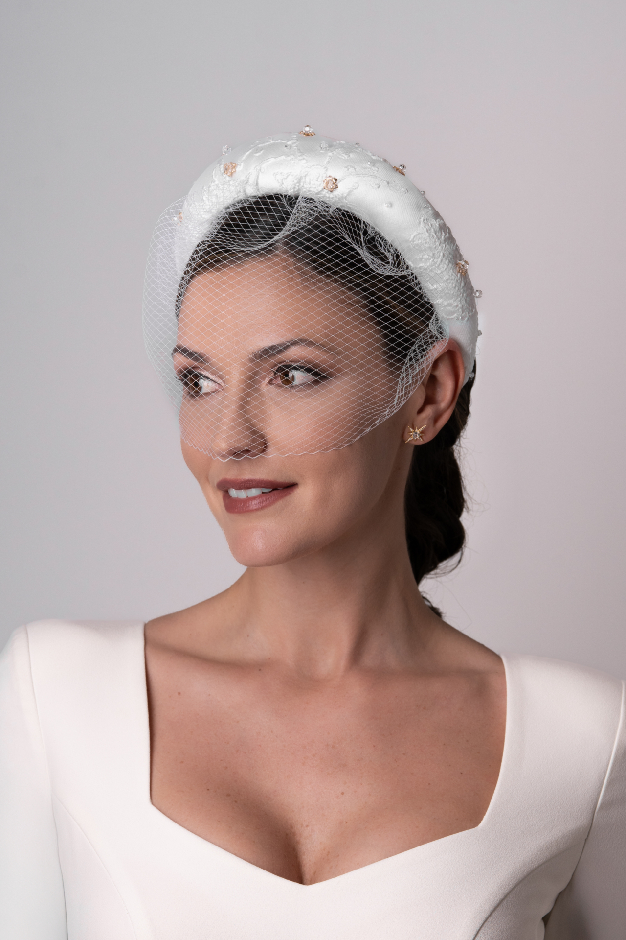 Diadema acolchada forrada en brocado blanco natural y adornada con bolitas y florecillas de metal dorado. Para el toque elegante una red al todo muy fina. Med. 40cm. X 4,5cm. Aprox.