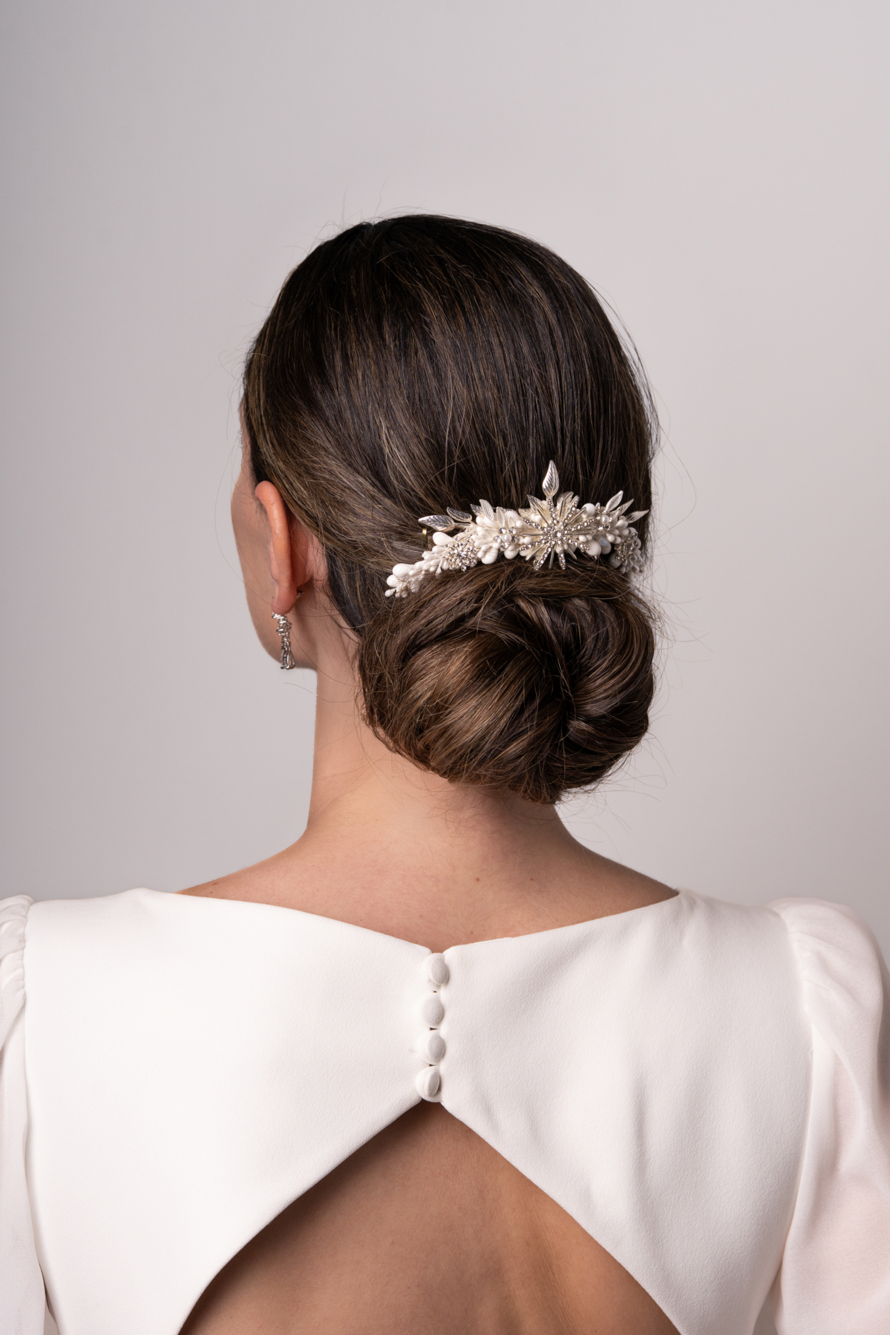 Tocadito de pistilitos pequeños nacarados y estrellas de metal plata. Lleva unas ramitas en metal plateado y una peina para acomodarlo tanto en un recogido, hacia un lado etc. Med. 16cm. X 3cm. Aprox.