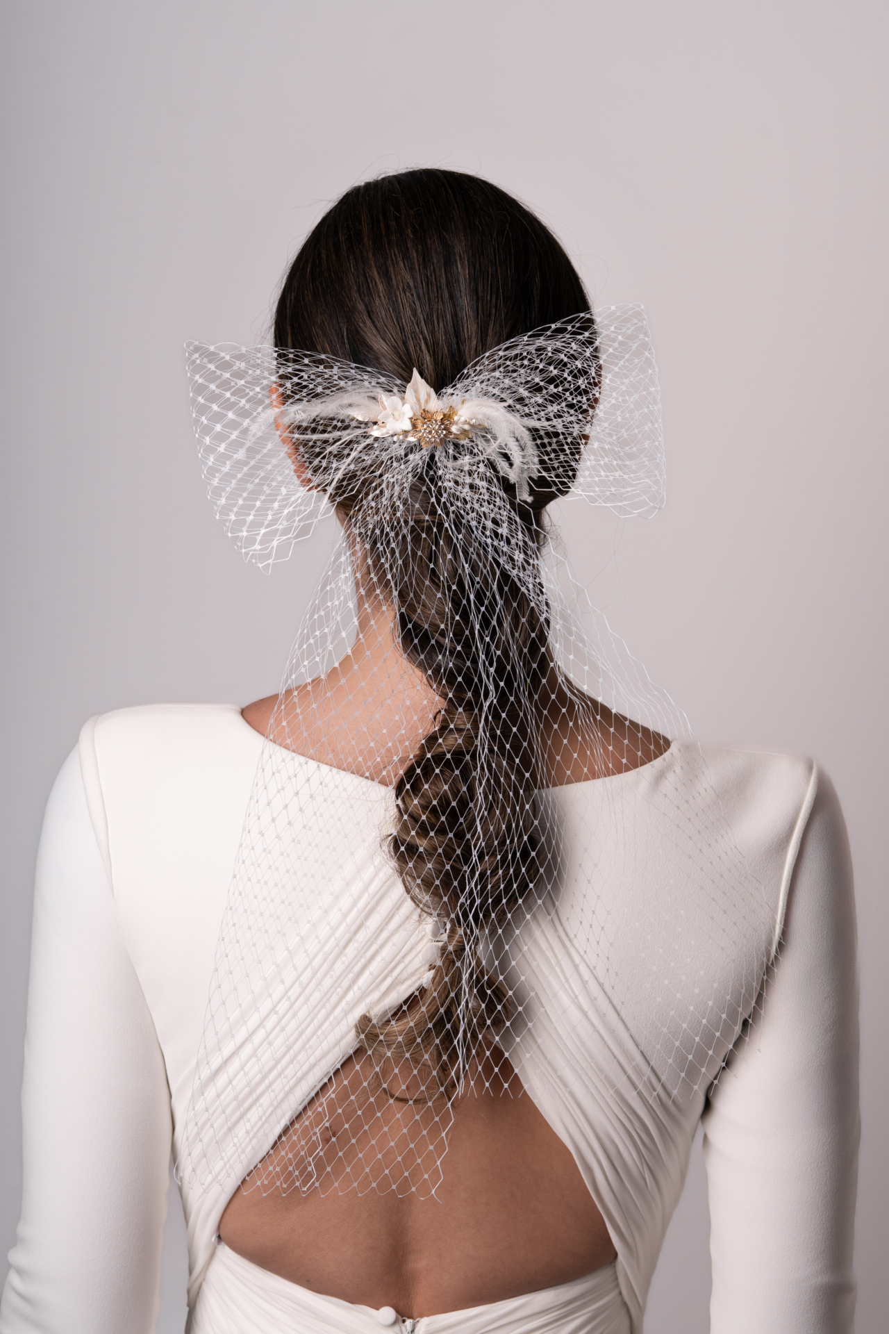 Lazada de red blanco natural con cabitos largos para poder dar forma en el recogido. Lleva un adorno de metal dorado en el centro y ramitas a los lados acompañado de pistilitos y brillos. Para colocarlo una peinecilla. Med. 26cm. X 41cm largo de los cabos. Aprox.
