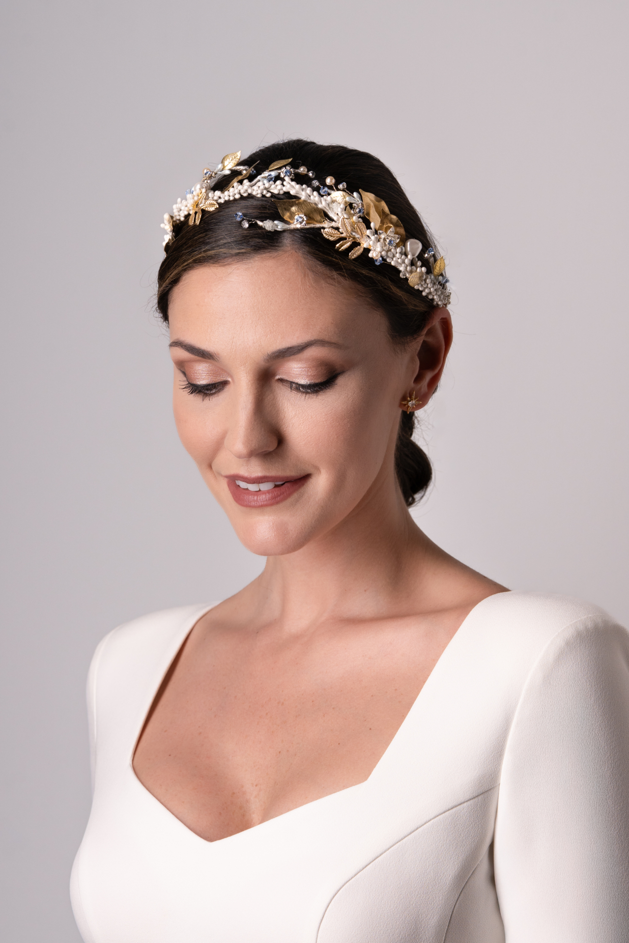 Diadema en metal plateado con tira de pistilitos nacarados entrelazada. Lleva una tira de brillos a todo lo largo. Como decoraciones unas estrellita de brillos y uno chatones. Med. 40cm. X 2,5cm. Aprox.