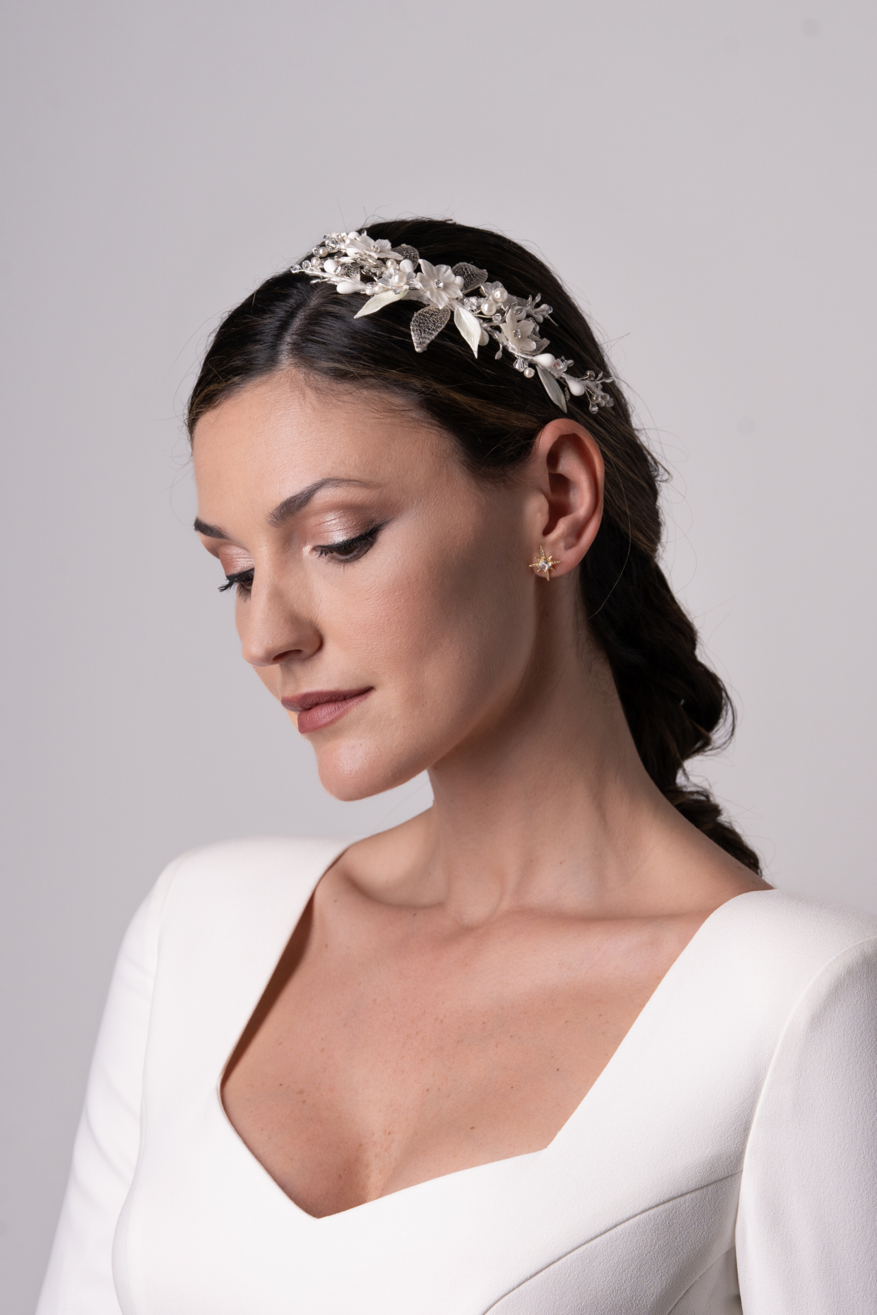 Tocado tipo joya joya en color natural y unas ramitas en plateado. Lleva tres flores hechas de porcelana y luego nacaradas con chatón central. Para dar volumen hojitas hechas de maya con bolas y perlitas acompañando. Med. 17cm. X 5cm. Aprox.