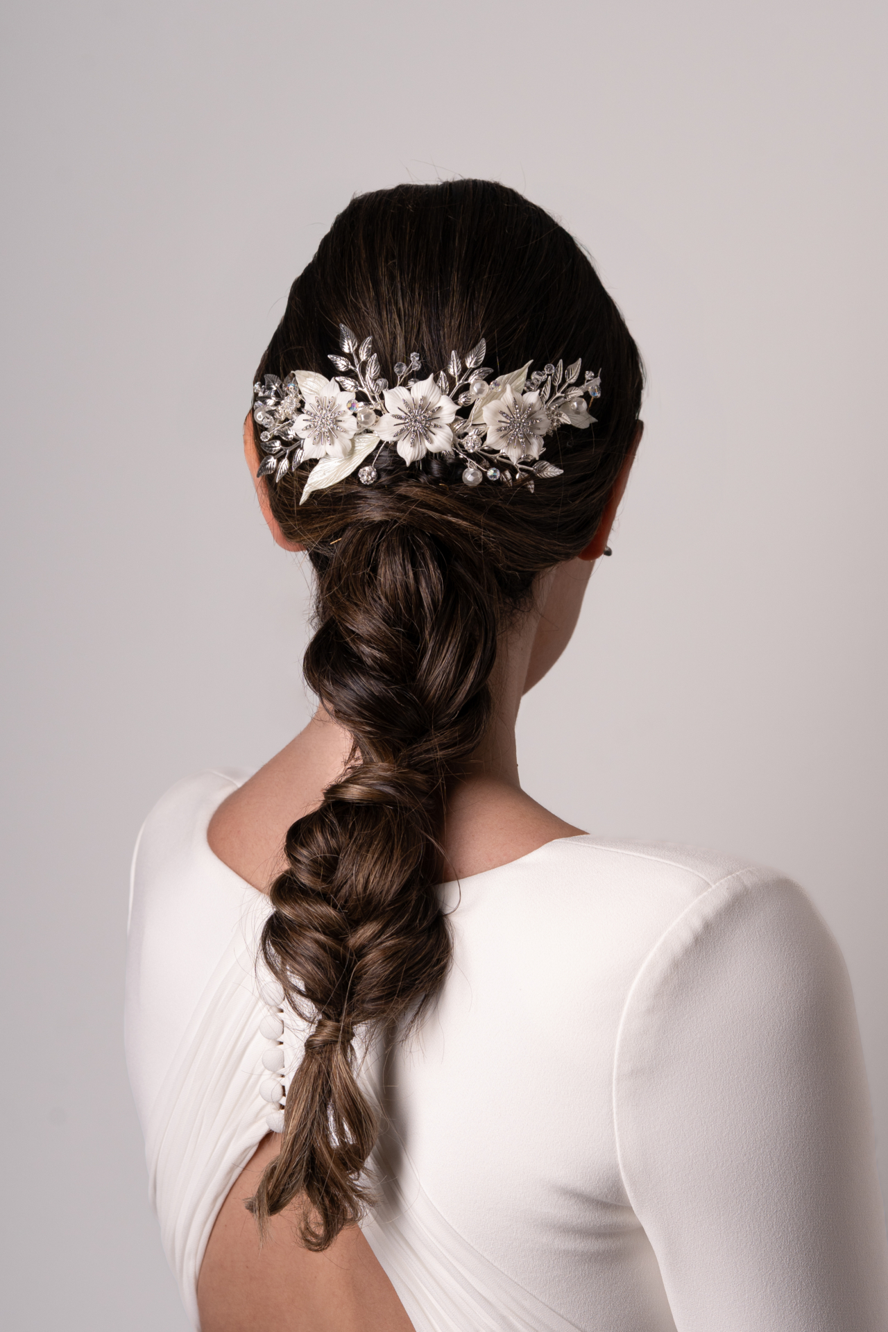 Tocado tipo joya joya en tonos blanco natural y metal plateado. Lleva tres flores de porcelana centrales con estrellitas de metal plateado en sus centros con brillos y unas hojitas tambien de porcelana. Acompañando unas bolas nacaradas y de cristal liadas. Med. 21cm. X 4,5cm. Aprox.